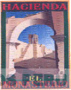 La denominación HACIENDA EL MONASTERIO escrita en letras características, en la parte central se aprecia la figura de un arco con muros y columnas, todo en los colores rojo, amarillo, azul, marrón, verde, beige y negro; conforme al modelo adjunto