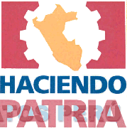El logotipo conformado por la denominación HACIENDO de color azul y PATRIA de color rojo escrita en letras características, en la parte superior se aprecia el mapa del Perú en color amarillo en medio de una rueda dentada blanca cuyos costados izquierdo y derecho son rojos; conforme al modelo adjunto