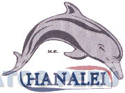 El logotipo conformado por la denominación HANALEI escrita en letras características entre dos líneas irregulares, en la parte superior la representación estilizada de un delfín y las letras M.R. (sin reivindicar), todo en la combinación de colores blanco, negro, gris, azul y rojo; conforme al modelo adjunto