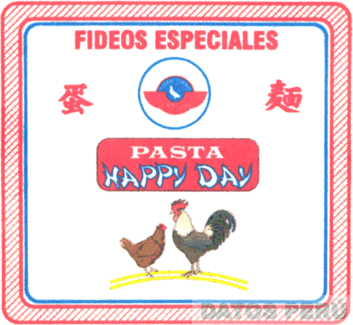 LA ETIQUETA QUE CONTIENE LA DENOMINACION HAPPY DAY ESCRITA EN LETRAS CARACTERISTICAS, Y LAS FIGURAS DE UNA GALLINA Y UN GALLO, SOBRE DOS LINEAS CURVADAS Y LA FIGURA DE UNA PALOMA DENTRO DE UNA FIGURA GEOMETRICA; DOS CARACTERES DEL IDIOMA CHINO, LEYENDAS ALUSIVAS AL PRODUCTO, EN LOS COLORES ROJO, AZUL, BLANCO, AMARILLO, ROSADO, MARRON Y VERDE; CONFORME AL MODELO ADJUNTO
