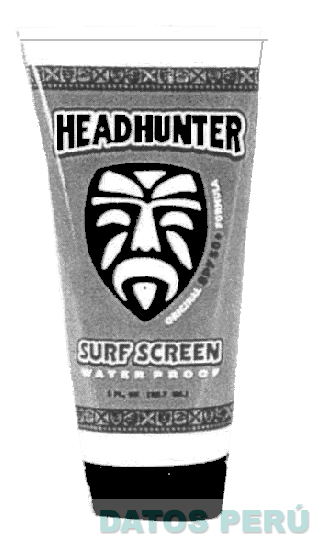 EL LOGOTIPO CONFORMADO POR LA FIGURA DE UN ENVASE CONTENIENDO LA DENOMINACIÓN HEADHUNTER ESCRITA EN LETRAS CARACTERÍSTICAS DEBAJO SE APRECIA LA FIGURA DE LA CARETA DE UN TRIBAL, DEBAJO SE APRECIA LA DENOMINACIÓN SURF SCREEN ESCRITA EN LETRAS CARACTERÍSTICAS Y FRASES ALUSIVAS AL PRODUCTO, EN LA PARTE SUPERIOR E INFERIOR SE APRECIAN LAS REPRESENTACIONES DE ASPAS Y CARETAS, SIN REIVINDICAR COLOR; CONFORME AL MODELO ADJUNTO
