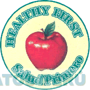 El logotipo conformado por la denominación HEALTHY FIRST SALUD PRIMERO escrita en letras características y la representación estilizada de una manzana en la parte central, todo en la combinación de colores amarillo, verde, rojo y blanco; conforme al modelo adjunto.
