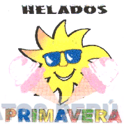 El logotipo conformado por la figura de un sol sonriente en color amarillo con dos de sus puntas en color anaranjado en degradé, anteojos en color celeste, pequeñas gotas que dan la apariencia de sudor que cae de su frente en color celeste, a los costados laterales dos barquillos de helados en forma de cono inclinados en color marrón, blanco y rosado, en la parte inferior la denominación PRIMAVERA en letras características en colores anaranjado, celeste, verde, amarillo y rosado, sin reivindicar el fondo blanco, en la parte superior la palabra HELADOS en color negro con copos de nieve en color blanco en la parte superior, conforme al modelo adjunto