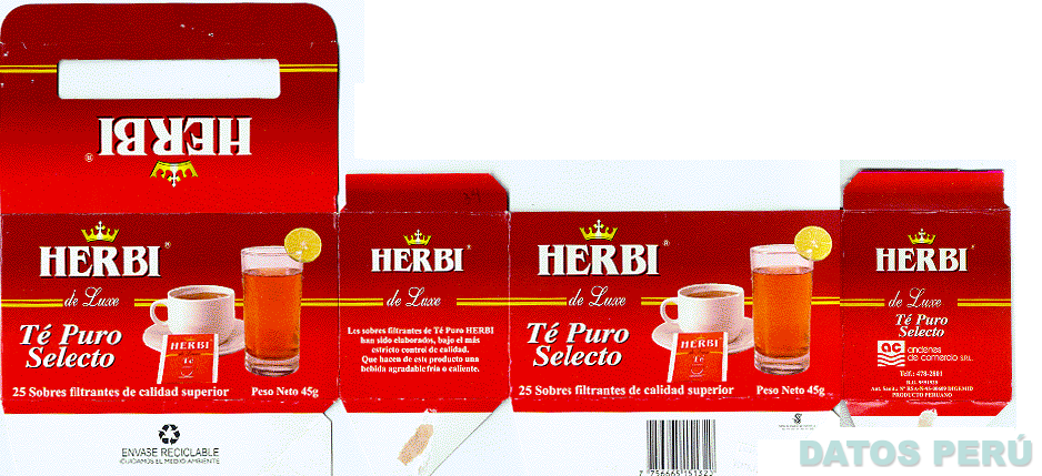 LA CAJA EMPAQUE CONSTITUIDA POR LA DENOMINACION HERBI ESCRITA EN LETRAS CARACTERISTICAS Y ENCIMA DE ESTA LA FIGURA DE UNA CORONA DE CINCO PUNTAS Y DEBAJO RAYAS HORIZONTALES, AL LADO DERECHO LA FIGURA DE UNA TAZA CON PLATO ATRAVESADO POR UN SOBRE DE TE FILTRANTE, LA FIGURA DE UN VASO CON UNA RODAJA DE LIMON Y FRASES ALUSIVAS AL PRODUCTO, TODO EN LA COMBINACION DE COLORES AMARILLO, ROJO, VERDE Y BLANCO; CONFORME AL MODELO ADJUNTO,