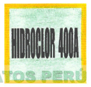El logotipo conformado por la denominación HIDROCLOR 400A escrita en letras y números característicos de color negro sobre un fondo de color verde hoja con bordes de color anaranjado oscuro, conforme al modelo adjunto