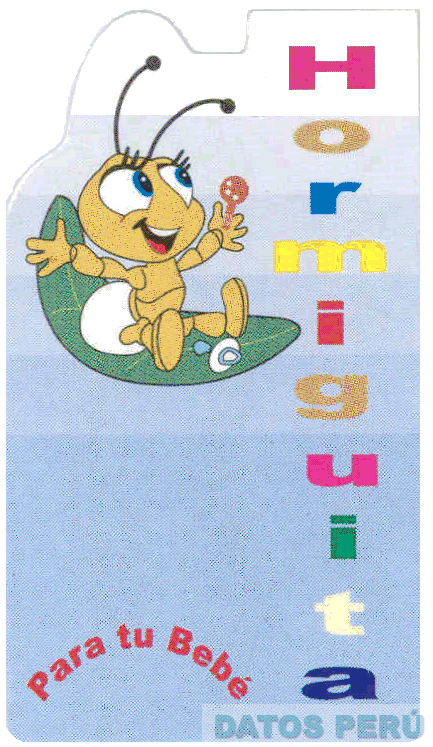 El logotipo conformado por la denominación HORMIGUITA escrita en letras características en forma vertical sin reivindicar colores; al lado izquierdo se aprecia la figura de una hormiguita de color mostaza con pañal sentada sobre una hoja de color verde; sosteniendo una sonaja sin reivindicar el color anaranjado y sin reivindicar el color celeste de los ojos; al pie de la hormiguita se aprecia un chupón de color celeste y blanco; sin reivindicar la frase PARA TU BEBE; conforme al modelo adjunto