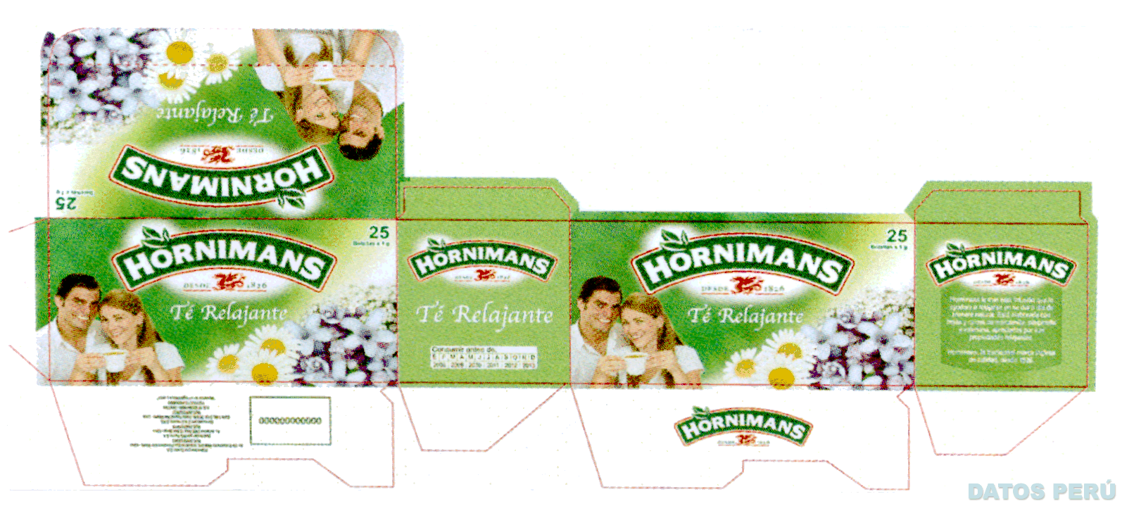 El empaque rectangular conformado en los distintos lados por la denominación HORNIMANS escrita en letras características dentro de un figura irregular, y en la parte superior la figura estilizada de tres hojas; acompañada en la parte superior, anterior y posterior por las figuras estilizadas de dos personas sosteniendo una taza, flores, frases alusivas al producto y la frase TÉ RELAJANTE escrita en letras características; en la parte lateral izquierda se aprecia frases alusivas al producto, una figura irregular y la frase TÉ RELAJANTE escrita en letras características, en la parte lateral derecha se aprecian frases alusivas al producto; todo en los colores rojo, verde en distintas tonalidades, amarillo, blanco, morado en distintas tonalidades, negro, marrón y anaranjado claro; conforme al modelo adjunto