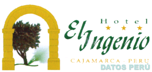 La denominación HOTEL EL INGENIO CAJAMARCA - PERU en letras características, con el logotipo constituido por la figura de un arco y un árbol de naranjo con sombra de reflejo del mismo árbol al costado derecho y tres estrellas encima de la palabra ingenio, todo en los colores ocre y verde oscuro; conforme al modelo adjunto