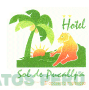 El logotipo conformado por la denominación HOTEL SOL DE PUCALLPA escrita en letras características, acompañada de la figura estilizada de una palmera, un sol, un campo, estrellas, dos líneas onduladas y un puma recostado, asimismo se aprecia la frase EL APOSENTO MISTERIOSO escrita en letras características, todo en los colores verde, amarillo, anaranjado (todos en distintas tonalidades); conforme al modelo adjunto