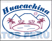 El logotipo conformado por la denominación HUACACHINA escrita en letras características y la figura circular donde se aprecia un paisaje conformado por las figuras estilizadas de tres cerros, dos palmeras, dos casas, un sol y un lago, todo en los colores rojo y azul; conforme al modelo adjunto