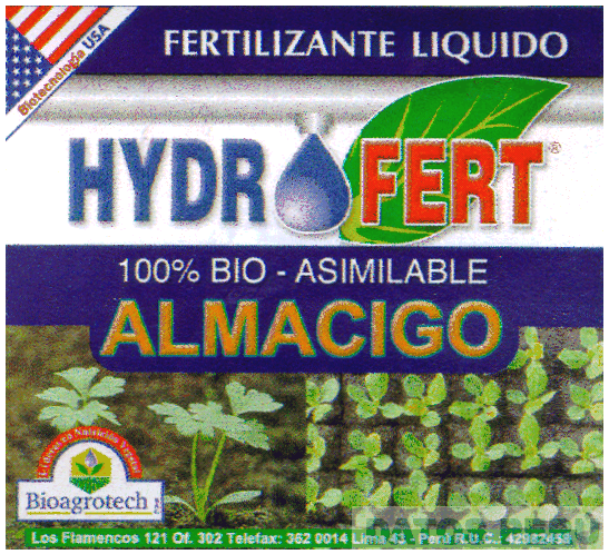 LA ETIQUETA CONFORMADA POR LA DENOMINACION HYDROFERT ESCRITA EN LETRAS CARACTERISTICAS EN LOS COLORES AZUL Y ROJO, DONDE LA LETRA O ESTA REPRESENTADA POR LA FIGURA DE UNA GOTA, DEBAJO DE LA CUAL SE APRECIA LA FRASE 100% BIO-ASIMILABLE Y LA DENOMINACION ALMACIGO ESCRITA EN LETRAS CARACTERISTICAS DE COLOR ANARANJADO, LA FIGURA DE PLANTAS, TODO SOBRE FONDO COLOR AZUL; CONFORME AL MODELO ADJUNTO