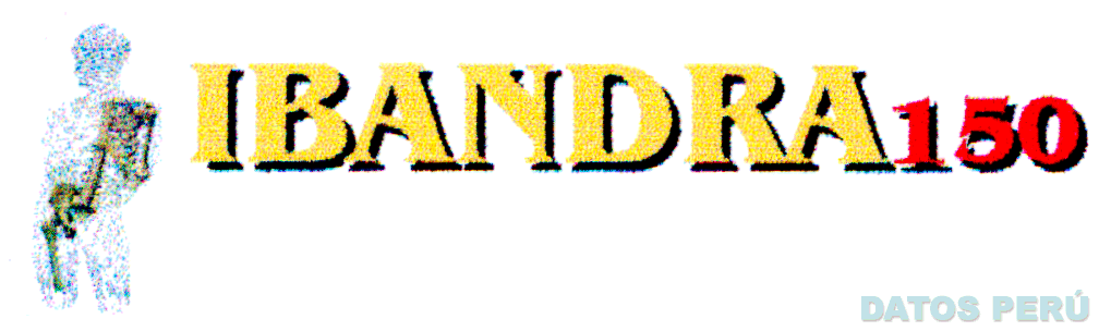 El logotipo conformado por la denominación IBANDRA 150 escrita en letras características, al lado izquierdo se aprecia la representación de parte de un esqueleto humano con columna, caja toráxica izquierda, brazo izquierdo, cadera y fémur derecho, así como parte de la silueta de un cuerpo humano, todo en la combinación de colores beige, amarillo, rojo, celeste y negro; conforme al modelo adjunto