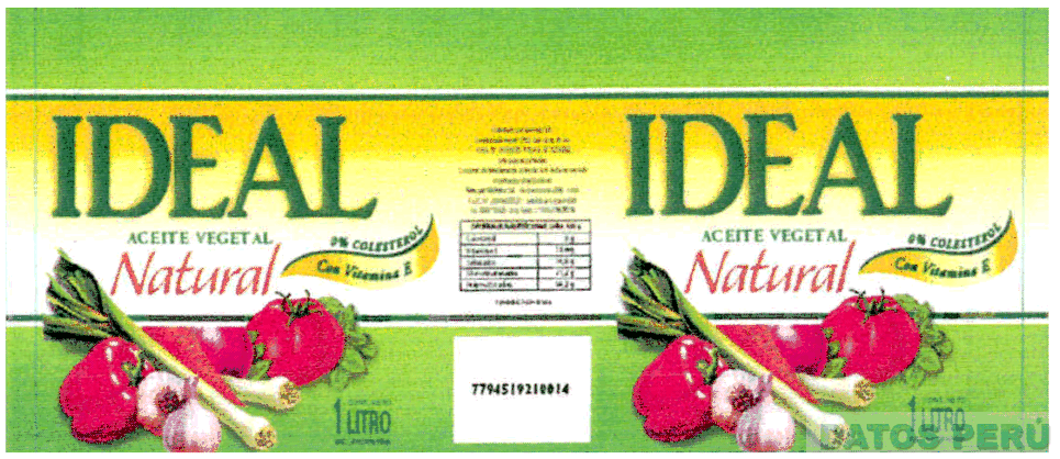 La etiqueta rectangular de fondo color verde, amarillo y blanco con líneas horizontales en colores verde oscuro, blanco conteniendo la denominación IDEAL en color verde y las palabras ACEITE VEGETAL NATURAL 0% COLESTEROL CON VITAMINA E (las cuales no se reivindican) en colores verde y rojo, debajo se muestra la representación de algunas legumbres y verduras con sus colores característicos rojo, verde y violeta, en la parte central se muestran palabras alusivas al producto en color negro; conforme al modelo adjunto