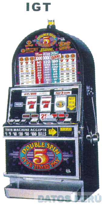 LA DENOMINACION IGT Y EL DISEÑO BIDIMENSIONAL DE UNA MAQUINA TRAGAMONEDA CON LA PARTE SUPERIOR EN FORMA MEDIA LUNA, TODO EN COLOR NEGRO; EN LA PARTE SUPERIOR SE APRECIA UN CUADRO DE COLOR ROJO, MORADO, VERDE, BLANCO Y NEGRO; DONDE APARECEN LOS PUNTAJES DEL JUEGO; DEBAJO DE ESTE TRES COLUMNAS DONDE APARECEN LAS FRASES DOUBLE SPIN EN AMARILLO Y FIVES TIME PAY EN ANARANJADO; CIRCUNDANDO UN NUMERO 5 DE COLOR ANARANJADO, SEGUN MODELO ADJUNTO