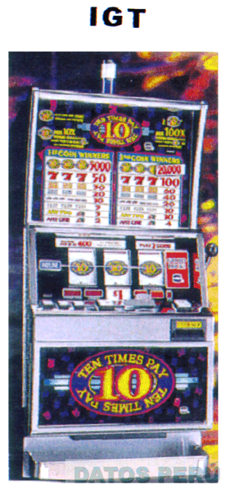 LA DENOMINACION IGT Y EL DISEÑO BIDIMENSIONAL DE UNA MAQUINA TRAGAMONEDA DE COLOR GRIS; EN LA PARTE SUPERIOR DEL MISMO SE APRECIAN DOS CUADROS DONDE APARECEN LOS PUNTAJES DEL JUEGO; EN LA PARTE CENTRAL HAY TRES COLUMNAS EN DONDE APARECE EL RESULTADO DEL JUEGO EN COLORES BLANCO, NEGRO, AMARILLO, AZUL Y ROJO; EN LA PARTE INFERIOR ESTA ESCRITA DENTRO DE UN OVALO LA FRASE TEN TIMES PAY DOS VECES ENCIMA Y DEBAJO DE UN NUMERO DIEZ, TODO EN COLOR AMARILLO, SEGUN MODELO ADJUNTO