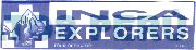 La denominación INCA EXPLORERS escrita en letras características en el interior de un recuadro dividido en dos horizontalmente; al lado izquierdo se aprecia una figura geométrica irregular que contiene la representación estilizada de un hombre con mochila en la espalda subiendo unas escaleras y como fondo se observa un cerro, todo en los colores azul y blanco; conforme al modelo adjunto