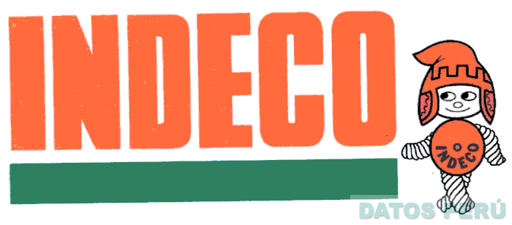 La denominación INDECO escrita en letras características sobre una franja horizontal y la figura de un muñeco con chullo y la denominación INDECO al interior de un círculo en la parte central del cuerpo del muñeco; en los colores anaranjado, verde, blanco y negro; conforme al modelo adjunto