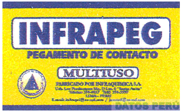 LA ETIQUETA CON LA DENOMINACIÓN INFRAPEG PEGAMENTO DE CONTACTO MULTIUSO Y OTRAS FRASES ALUSIVAS AL PRODUCTO; EN LA PARTE INFERIOR IZQUIERDA DENTRO DE UN CÍRCULO SE APRECIA UNA PIRÁMIDE CON LAS LETRAS I.Q. EN UNO DE SUS LADOS Y LA DENOMINACIÓN ADHESIVOS DE CONTACTO INFRAQUIMICA S.A.; EN COLORES AMARILLO, AZUL, BLANCO Y NEGRO; CONFORME AL MODELO ADJUNTO