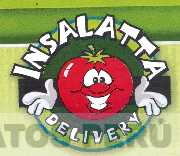 El logotipo conformado por la denominación INSALATTA escrita en letras características, la representación caricaturesca de un tomate, con manos, y la palabra DELIVERY todo sobrepuesta dentro de una figura circular; en los colores rojo, blanco, negro, turquesa y dos tonalidades de verde; todo sobre un fondo irregular en los colores blanco y dos tonalidades de verde; conforme al modelo adjunto.