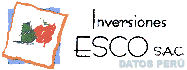 El logotipo conformado por la denominación INVERSIONES ESCO S.A.C. escrita en letras características, a cuyo lado izquierdo se aprecian dos figuras irregulares que representan una pera y una manzana, ambas enmarcadas por un recuadro inclinado, que a su vez se encuentra sobrepuesto a un cuadrado; todo en los colores rojo, blanco, negro, verde, anaranjado y celeste; conforme al modelo adjunto