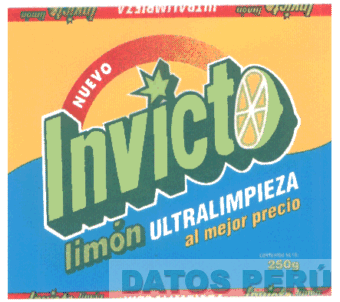 LA FIGURA DE UN EMPAQUE QUE CONTIENE LA PALABRA INVICTO, EN LETRAS CARACTERISTICAS, DONDE LA LETRA "O" ESTA REPRESENTADO POR EL DISEÑO ESTILIZADO DE UN LIMON CORTADO Y EL SIGNO DE PUNTUACION EN LA LETRA "I" POR UNA ESTRELLA; EN LA PARTE SUPERIOR DEL VOCABLO INVICTO, LA DENOMINACION NUEVO DENTRO DE UNA FRANJA CURVA A MANERA DE ARCO IRIS Y EN LA PARTE INFERIOR, LA FRASE LIMON ULTRALIMPIEZA AL MEJOR PRECIO, TODO EN LOS COLORES AMARILLO, ROJO, BLANCO, VERDE OSCURO, VERDE LIMON Y AZUL; CONFORME AL MODELO ADJUNTO,