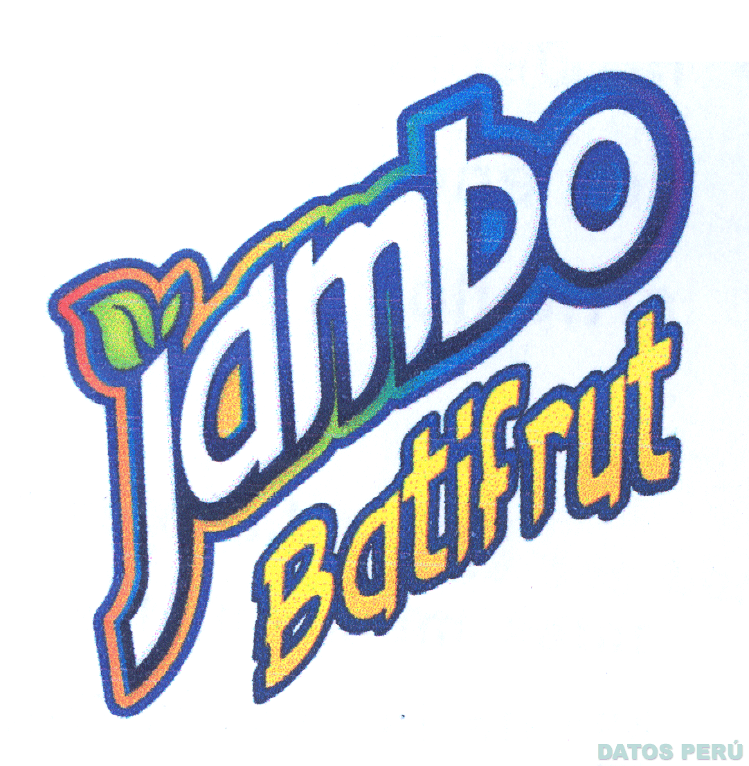 El logotipo conformado por la denominación JAMBO BATIFRUT escrita en letras características, todo en colores amarillo, azul en diversas tonalidades, anaranjado, celeste, verde, negro y blanco; conforme al modelo adjunto