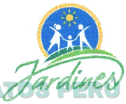 El logotipo conformado por la denominación JARDINES escrita en letras características de color verde y en la parte superior una figura circular bordeada por una línea amarilla, en la cual se aprecia tres siluetas en color blanco que representan a una familia tomada de la mano con un sol amarillo en la parte superior y el fondo de color azul; conforme al modelo adjunto