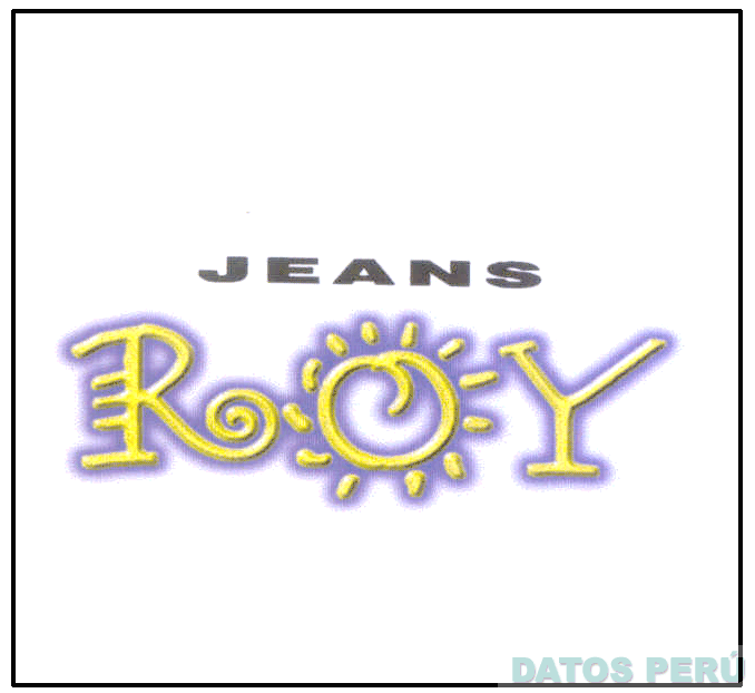 EL LOGOTIPO CONSTITUIDO POR LA DENOMINACION JEANS ROY ESCRITA EN LETRAS CARACTERISTICAS DONDE LA LETRA O DE LA DENOMINACION ROY SE ASEMEJA A UN SOL ESTILIZADO, TODO EN LOS COLORES NEGRO, LILA Y AMARILLO; CONFORME AL MODELO ADJUNTO