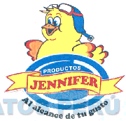 El logotipo conformado por la denominación JENNIFER escrita en letras características dentro de una cinta ondulante, todo dentro de una figura ovoidal, en la parte superior de la figura ovoidal se aprecia la figura estilizada de un pollito con gorra y lentes sobre la cabeza, todo en la combinación de colores azul cian, rojo, amarillo, negro, blanco; conforme al modelo adjunto