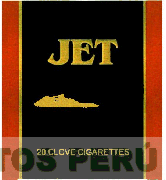 La etiqueta rectangular, dividida en tres campos, en la parte central que es más ancha y de fondo negro, se aprecia la denominación JET escrita en letras características, una figura irregular y la frase 20 CLOVE CIGARETTES escrita en letras características (sin reivindicar), todo en color dorado, y a los costados una franja delgada de color dorado y una franja ancha de color rojo a ambos lados; conforme al modelo adjunto
