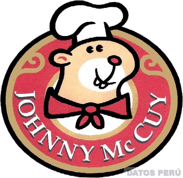 La denominación JOHNNY MC CUY escrita en letras características y en la parte inferior de un óvalo de fondo rojo y en letras blancas; en el centro del óvalo destaca la cabeza estilizada de un cuy de fantasía, sonriente, con un lazo rojo en el cuello y un pequeño gorro de cocinero, todo el diseño en bordes negros y fondo blanco, combinando los colores rojo, negro, blanco y dorado; conforme al modelo adjunto