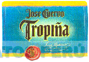 La denominación JOSE CUERVO TROPIÑA escrita en letras características, dentro de una etiqueta rectangular cuya configuración y rebordes presentan apariencia de papel pergamino y en el extremo inferior izquierdo un sello lacrado circular, todo en los colores amarillo, azul en diversas tonalidades, rojo, blanco y negro; conforme al modelo adjunto