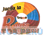 El logotipo conformado por la denominación JUEGA LA RULETA REGALONA escrita en letras características, la cual se encuentra superpuesta a la representación de una ruleta que contiene la denominación TROME escrita en letras características, todo en los colores amarillo, celeste, negro, blanco, morado, anaranjado y rojo; conforme al modelo adjunto