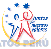La denominación JUNTOS POR NUESTROS VALORES al costado de dos figuras humanizadas y sobre una línea semicircular a manera de media luna, notándose en su parte superior izquierda cinco estrellas consecutivas, en la combinación de colores azul, rojo y amarillo; conforme al modelo adjunto