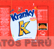 La etiqueta conformada por la denominación KRANKY escrita en letras características, debajo la representación de la letra K humanizada, asimismo la denominación NUEVO escrita en letras características dentro de una figura ovalada (sin reivindicar la figura) y la letra B escrita en forma característica dentro de una figura geométrica (sin reivindicar la figura), en la parte superior se aprecian dos estrellas, además de frases informativas del producto sin reivindicar, todo en la combinación de colores rojo, azul, amarillo, celeste, negro y blanco; conforme al modelo adjunto