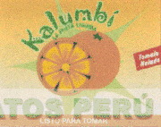 La etiqueta conformada por la imagen en el centro de una naranja y media color anaranjado sobre una figura irregular de color verde limón, así como por la denominación KALUMBÍ y la frase LA FRUTA LÍQUIDA escrita en letras características de color verde; en la parte inferior una franja rectangular color anaranjado dentro de la cual puede apreciarse la frase LISTO PARA TOMAR; todo sobre un fondo color anaranjado, el cual va difuminándose del extremo superior (anaranjado oscuro) al inferior (anaranjado pálido); conforme al modelo adjunto