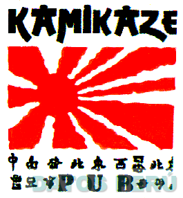 LA DENOMINACION KAMIKAZE EN LETRAS CARACTERISTICAS DE COLOR NEGRO; POR DEBAJO LA FIGURA ESTILIZADA DE UN SOL RADIANTE DE COLOR ROJO; EN LA PARTE INFERIOR CARACTERES DEL IDIOMA JAPONES Y LA PALABRA PUB, TODO EN COLOR NEGRO, CONFORME AL FACSIMIL ADJUNTO,