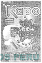 Una etiqueta de forma rectangular que contiene en su interior la figura de una frambuesa animada y una máquina computadora; en la parte superior la denominación KAPO en letras características y en la parte inferior la denominación EUGENIO FRAMBUESA-BEBIDA FANTASIA SABOR FRAMBUESA y en la parte inferior un rectángulo que contiene la denominación