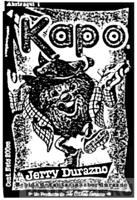 UNA ETIQUETA RECTANGULAR QUE CONTIENE EN SU INTERIOR LA FIGURA DE UN DURAZNO ANIMADO CON UNA CAMISA A CUADROS Y UN GORRO Y EN LA MANO TIENE UNA PORCION DE PIZZA; EN LA PARTE SUPERIOR LA DENOMINACION KAPO EN LETRAS CARACTERISTICAS Y EN LA PARTE INFERIOR LA DENOMINACION JERRY DURAZNO DENTRO DE UN RECUADRO Y DEBAJO UN RECTANGULO QUE CONTIENE LA FRASE UN PRODUCTO DE THE COCA-COLA COMPANY, SEGUN EL MODELO ADJUNTO,
