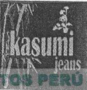 El logotipo conformado por la denominación KASUMI JEANS escrita en letras características y la representación de diversas figuras irregulares, todo en los colores gris y negro; conforme al modelo adjunto