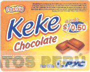 La etiqueta con fondo de tonos amarillo y anaranjado, conteniendo las palabras KEKE en letras características de color azul contorneadas de blanco y rojo, y CHOCOLATE en letras características color marrón contorneadas en blanco, con la figura de dos tabletas de chocolate del mismo color, y el logotipo de la marca PYC en letras características de color azul dentro de una figura ovalada de color blanco con unos círculos de colores anaranjado, amarillo y azul; conforme al modelo adjunto (sin reivindicar la expresión KEKE CHOCOLATE)