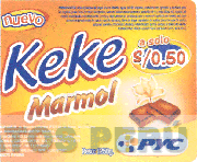Etiqueta con fondo de tonos amarillo y anaranjado, conteniendo las palabras KEKE en letras características de color azul contorneadas de blanco y rojo, y MARMOL en letras características de colores marrón y crema contorneadas en blanco, con la figura de una flor de vainilla sobre dos tabletas de chocolate, y el logotipo de la marca PYC en letras características de color azul dentro de una figura ovalada de fondo blanco con unos círculos de colores anaranjado, amarillo y azul; conforme al modelo adjunto