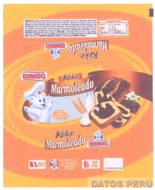 La envoltura desplegada conformada por las denominaciones BIMBO y KEKE MARMOLEADO CON VITAMINAS B1, B2, B3 y HIERRO escrita en letras características y figuras estilizadas de un osito con gorro de cocinero y brazos abiertos, un keke cortado en pedazos, una botella de leche, dos espigas, una flor y dos huevos, todo en los colores anaranjado, amarillo, rojo, verde, blanco, marrón y azul; conforme al modelo adjunto