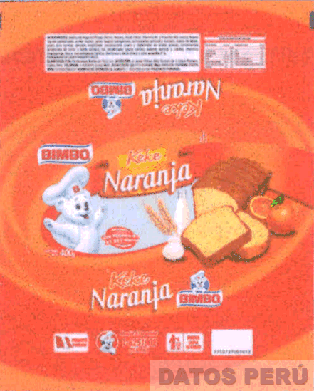 La envoltura despelgada conformada por las denominaciones BIMBO y KEKE NARANJA CON VITAMINAS B1, B2, B3 y HIERRO escrita en letras características y figuras estilizadas de un osito con gorro de cocinero y brazos extendidos, keke cortado en pedazos, una botella de leche, dos espigas, una naraja y media y dos huevos; todo en los colores anaranjado, amarillo, rojo, verde, blanco y azul; conforme al modelo adjunto