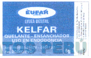 La etiqueta rectangular que contiene la denominación KELFAR escrita en letras características y en la parte superior una figura ovalada conteniendo la denominación EUFAR escrita en letras características y varias frases alusivas al producto, en los colores azul, blanco y negro; conforme al modelo adjunto