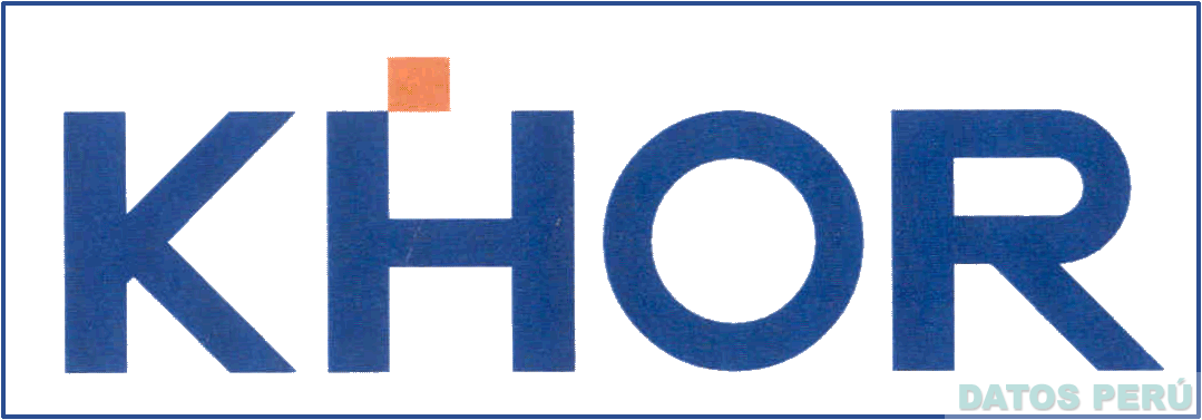 El logotipo conformado por la denominación KHOR escrita en letras características, sobre la letra H se aprecia la figura de un cuadrado, todo dentro de un rectángulo; todo en la combinación de colores azul, blanco y anaranjado; conforme al modelo adjunto