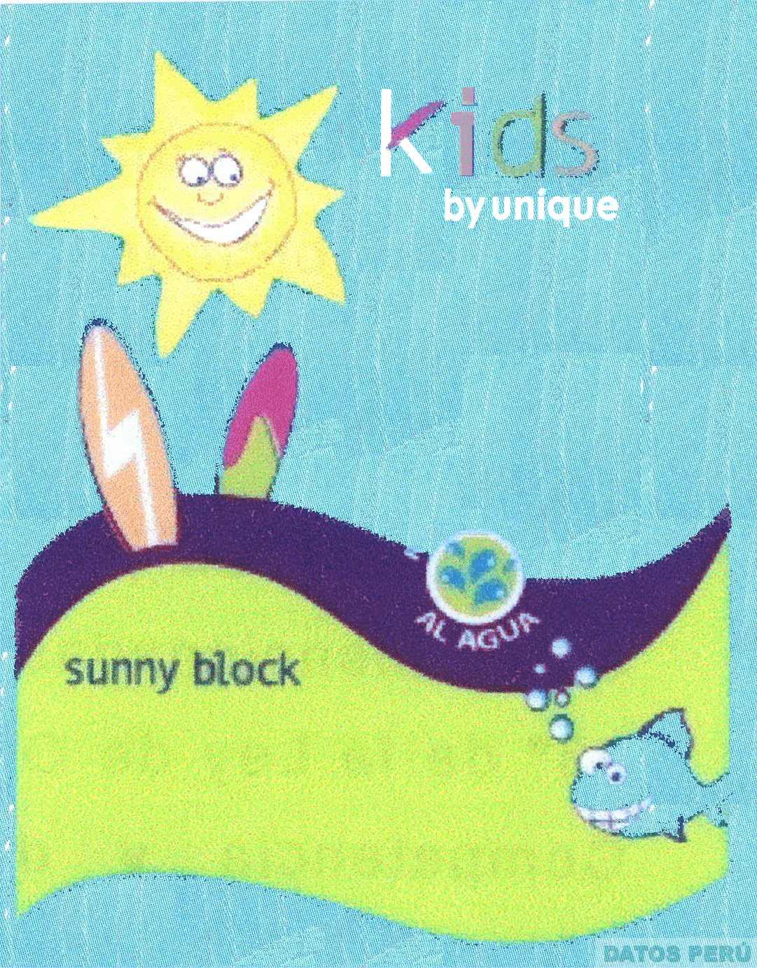La etiqueta rectangular que contiene el diseño humanizado del sol al lado del cual se consigna la denominación KIDS BY UNIQUE escrita en letras características, apreciándose en su parte inferior dos franjas oblicuas de diverso tamaño asemejándose a un mar en movimiento, así como dos tablas de surf en diseño estilizado; debajo se consigna la denominación SUNNY BLOCK y en el extremo derecho se inserta el diseño de un círculo circundado por la frase RESISTENTE AL AGUA, conteniendo en su interior varias gotas de agua, apreciándose en su parte inferior un pez sonriente del cual salen burbujas de aire; todo en la combinación de colores celeste, turquesa, amarillo, azul, verde, anaranjado, blanco y magenta; conforme al modelo adjunto