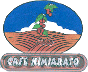 El logotipo conformado por la denominación KIMIARATO escrita en letras características sobre un fondo ovoidal y en la parte superior una figura circular conteniendo la representación de un campo de café con plantas y granos con el horizonte de cielo y nubes; en colores café, rojo, negro, blanco y azul; conforme al modelo adjunto