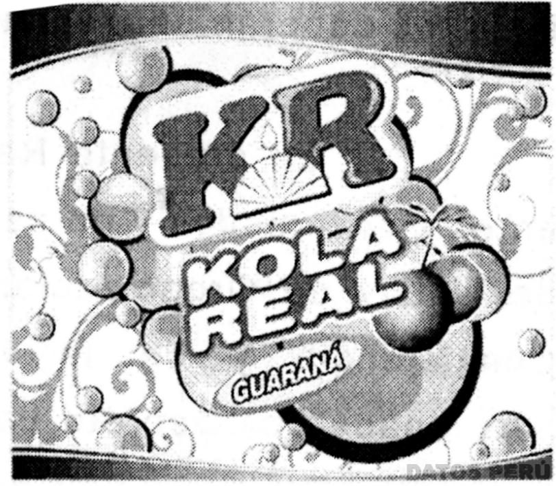 El logotipo conformado por la denominación KR KOLA REAL escrita en letras características, acompañada de un semicírculo con líneas, la figura estilizada de dos frutos de guaraná; la denominación GUARANÁ (sin reivindicar) escrita en letras características dentro de una figura ovalada y líneas ondeadas; todo superpuesto a un fondo con la representación de círculos que se asemejan a burbujas de distintos tamaños; conforme al modelo adjunto