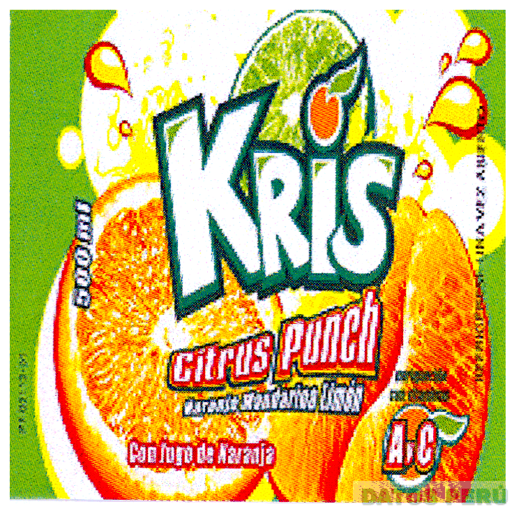 El logotipo conformado por la denominación KRIS escrita en letras características, donde el punto de la letra I está representado por la figura de una naranja, acompañada de la representación estilizada de la mitad de un limón, de la mitad de una naranja y dos gajos de mandarina; alrededor se aprecian las figuras estilizadas de varias gotas, figuras irregulares y frases alusivas al producto (sin reivindicar), debajo la frase ENRIQUECIDA CON VITAMINAS A y C sobre la representación estilizada de una naranja, todo en los colores anaranjado, rojo, blanco, amarillo y verde; conforme al modelo adjunto